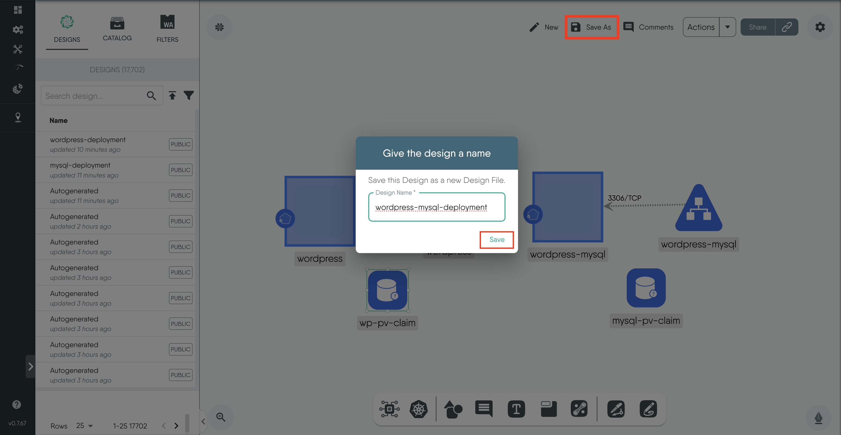 Clicking on the names of the designs on the Designs tab displays the visual representations of the various Kubernetes resources and their relationships on the canvas.